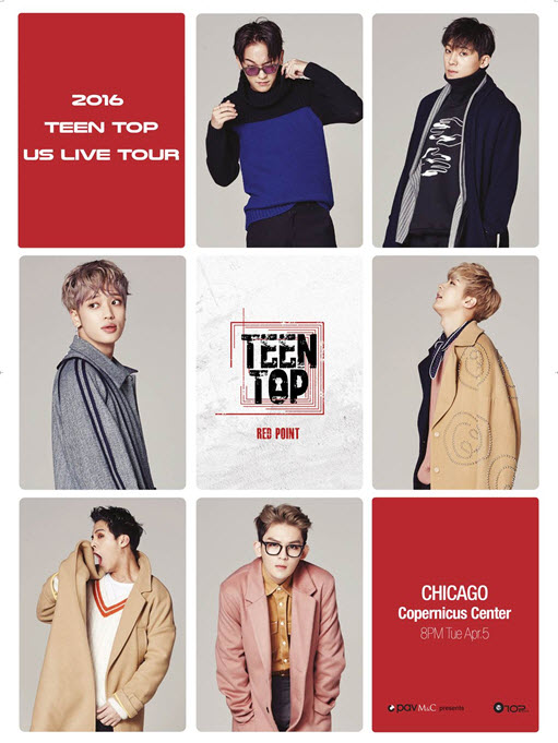 Recently they released a new album titled ‘Red Point’ and planned to have their 2nd solo concert tour in the US. Studio PAV M & C, as the sole promoter based in NYC, presents ‘2016 Teen Top US Live Tour’ for the fans called ‘Angel’ in the US, starting from New York City on April 2, Chicago on April 5, Dallas on April 8 and Los Angeles on April 10. This show at Copernicus Center is the first show in the area so they are excited to meet the fans in Chicago.