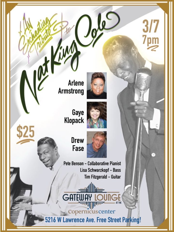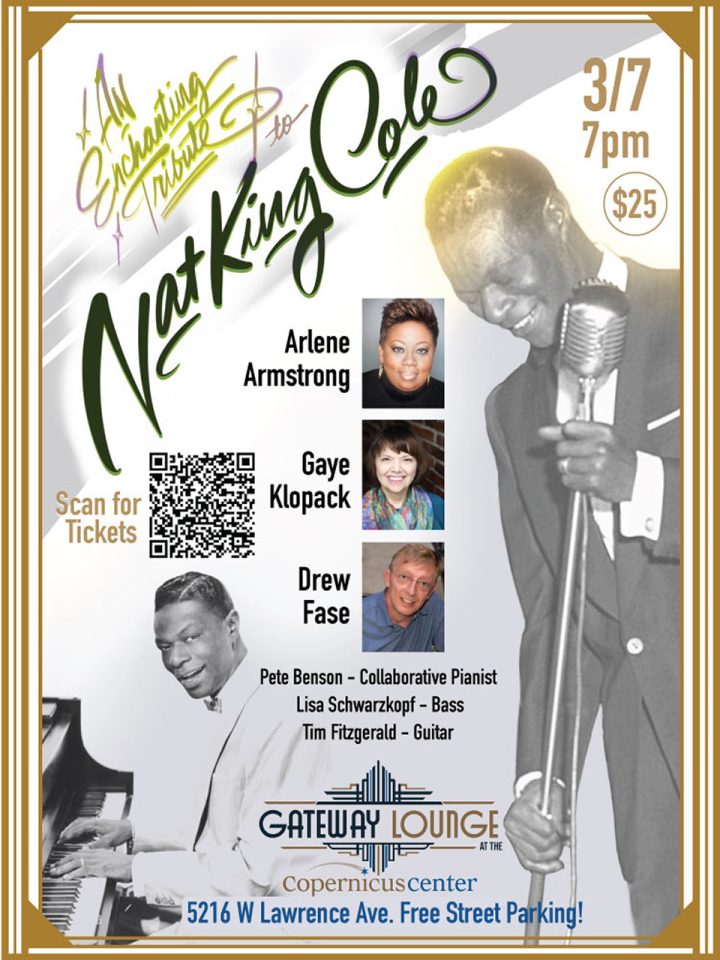 A Tribute to Nat King Cole at the Gateway Lounge March 7 highlights some of Nat’s well known songs and some not so well known presented by singers, Arlene Armstrong, Gaye Klopack and Drew Fase. Our band ensemble joins use with Pete Benson. piano, Tim Fitzgerald, guitar and Lisa Schwarzkopf, bass, the same configuration as Nat’s own ensemble.