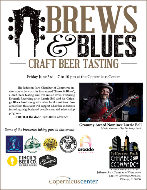 The Jefferson Park Chamber of Commerce invites you to be a part its first annual → Brews & Blues ←, a craft beer tasting and live music event. Featuring Delmark Recording artist Lurrie Bell and his Chicago Blues Band along with other local musicians.
