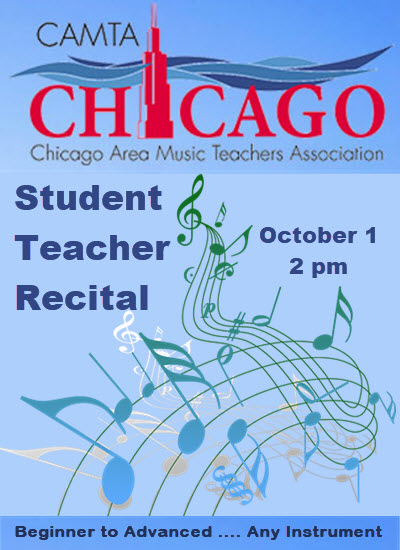 The Fall CAMTA Student and Teacher Recital will take place Sunday, October 1, 2017, 2:00 PM at Copernicus Center Annex, 5214 W. Lawrence in Chicago (use separate entrance). Program information from teachers must be received as soon as possible . CAMTA members are encouraged to participate in the student and teacher recitals held in fall and spring. A teacher may submit up to three students. These recitals provide excellent motivation for students and for us to practice and set goals.