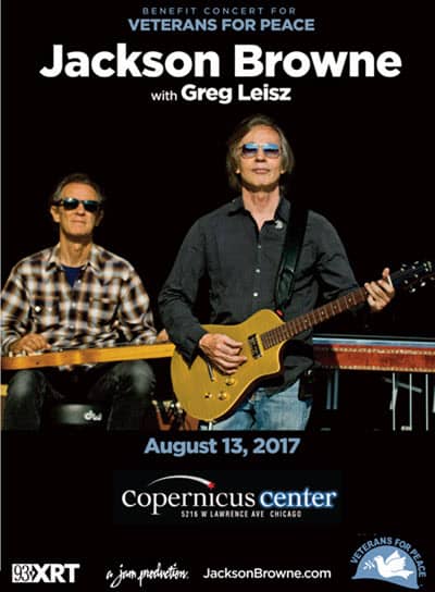 Singer songwriter Jackson Browne is performing a benefit concert on Sunday, August 13th to support Veterans For Peace. The concert is scheduled for the final day of the Veterans For Peace 23rd Annual Convention. Accompanying Jackson Browne at the benefit concert is long time band mate and multi-instrumentalist Greg Leisz.