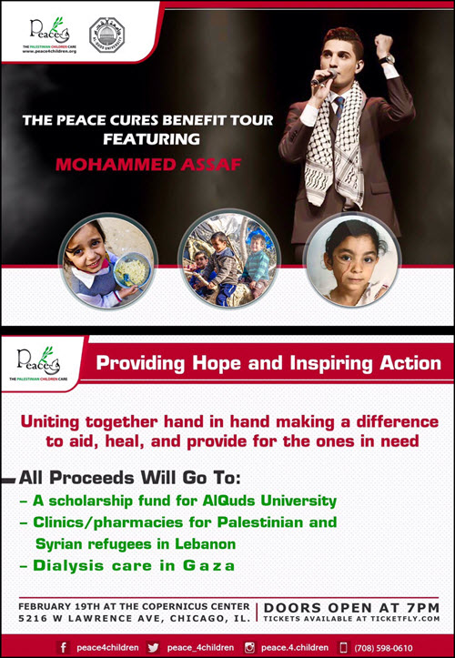 Peace Cures Benefit Tour → Peace / The Palestinian Children Care organization is proud to announce a benefit tour featuring Palestinian singing sensation Mohammed Assaf. Assaf has donated his efforts, performing free of charge. The Peace Cures Benefit Tour 2016 will visit 7 major U.S. cities starting February 19th in Chicago. Other tour locations include: Houston 2/20, Anaheim 2/26, Sacramento 2/27, Detroit 3/4, Orlando 3/5, New Jersey 3/11, and a return to Chicago (date TBD). All proceeds will go to: