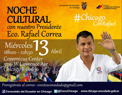 El Consulado del Ecuador en Chicago invita a nuestra comunidad a compartir una noche cultural junto a nuestro Presidente Eco. Rafael Correa. Regístrate al correo [email protected]