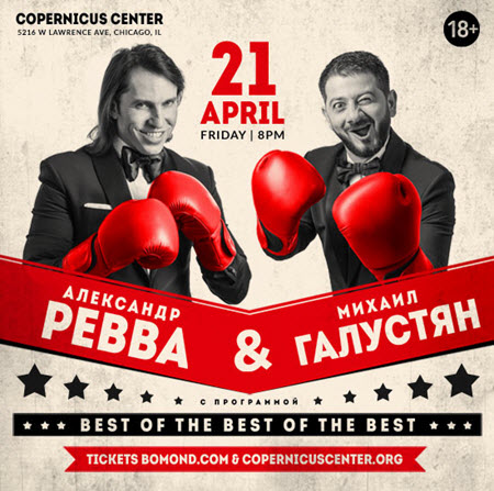Bugz Entertainment presents Revva & Galustyan “Best of the Best of the Best.” This Russian Comedy team is in Chicago for only ONE show. Don’t miss the hysterical entertainment and laughter Revva Alexander and Mikhail Galustjan will bring..