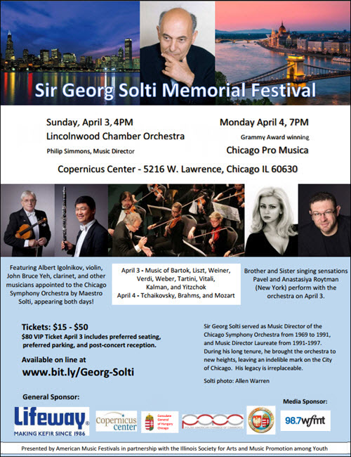 The Sir Georg Solti Memorial Festival in Chicago includes concerts by the Lincolnwood Chamber Orchestra Sunday April 3 and by Chicago Pro Musica Monday April 4!