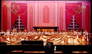 The Sword-bearer invites them all to a banquet. The first toast is to the father of Stefan and Zbigniew. The assembled gathering drinks his health, though each is lost in his own thoughts. The two girls are no longer convinced that the two brothers truly wish to remain bachelors, and determine to put their courage to the test. Maciej and Skołuba are resentful at one another on account of the wild boar. Damazy pins his hopes on being able to keep his rivals in check using the ghost of the manor. He whispers something into Skołuba’s ear, which the irritable steward acknowledges with loud applause (finale).