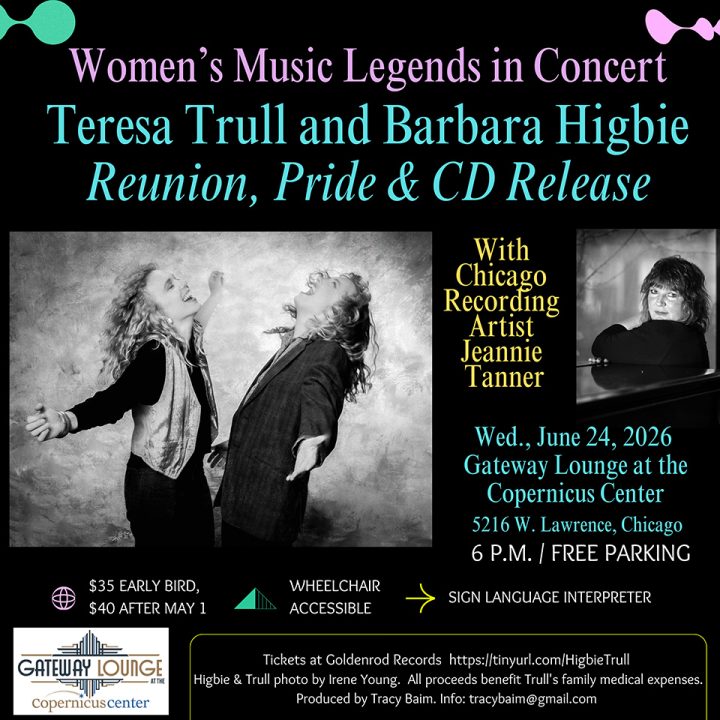 Two national legends of women’s music return to Chicago for a rare concert. Teresa Trull & Barbara Higbie have been entertaining with their passionate and spirited music for many decades. They will celebrate Reunion, Pride & their new CD release in time for Pride Week in Chicago. They will be joined by opening act, Chicago’s own musical legend, Jeannie Tanner. All at the beautiful and intimate Gateway Lounge at Copernicus Center on Chicago’s Northwest Side. The venue is wheelchair accessible. There will be sign language interpreters. Tickets $35 for early bird, $40 after May 1. A limited number of higher-priced tickets available to include a post-show dinner with the artists. Tickets at Goldenrod Records https: tinyurl.com/HigbieTrull. All proceeds benefit Trull’s family medical expenses.