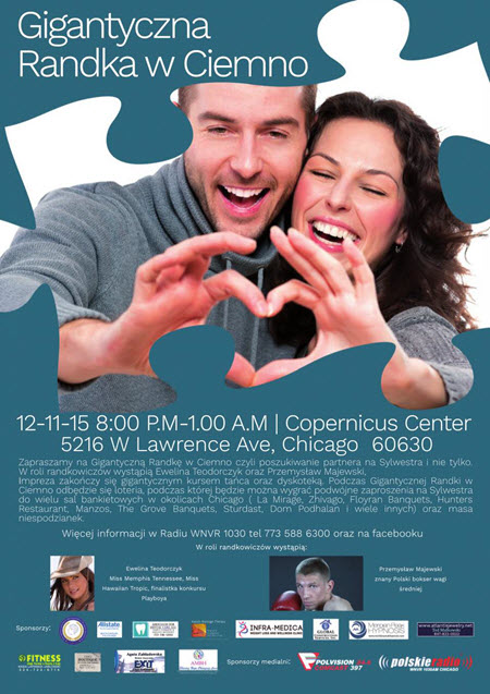 Całą imprezę poprowadzi z ogromnym temperamentem i jeszcze większym poczuciem humoru Kasia Popko z radia 1030AM, a Kasia Łapińska-Jabłoński trenerka Aerobiku, Zumby, Judo wielokrotna medalistka Mistrzostw Polski zarazi nas niesamowita energia. Na scenie weźmiemy w obroty Przemka “The Machine” Majewskiego, który nie ukrywa, że szuka dziewczyny i wierzy, że znajdzie ją znajdzie podczas Gigantycznej Randki w Ciemno. W roli randkowiczow wystapia Ewelina Teodorczyk Miss Memphis Tennessee, Miss Hawaiian Tropic, finalistka Playboya, oraz Przemyslaw Majewski znany Polski mistrz wagi sredniej. Zapraszamy rowniez na loterie, gdzie będzie można wygrać podwójne zaproszenia na Sylwestra do wielu sal bankietowych w okolicach Chicago! ( miedzy innymi La Mirage, Zhivago, Floryan Banquets, Hunters Restaurant, Manzos, The Grove Banquets, Sturdast, Dom Podhalan i wiele innych!!!)