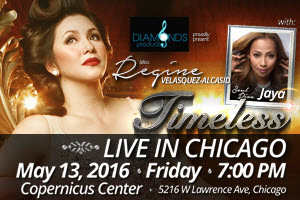 “Timeless” with Regine Velasquez and Jaya at the prestigious Copernicus Center in Chicago on May 13, 2016 at 7pm is the most awaited Filipino concert of the year. It is headlined by the Philippines’ Best Selling Artist of All Time, Miss Regine Velasquez along with the Philippines’ Soul Diva, Jaya. Guest Appearances by Gene Flores