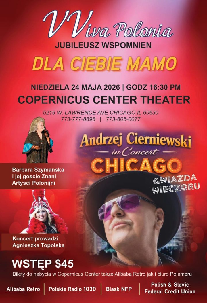 The star of our revue will be Andrzej Cierniewski a renowned and highly esteemed Polish- diaspora artist, whose beautiful and nostalgic pieces are widely known both in Poland and in Chicago. Furthermore, at least twenty more artists active creators and performers who are integral to Chicago’s daily musical life-will take part. These include Marek Kalinowski, a magnificent multi-instrumentalist, composer, vocalist and certified accordionist; Andrzej Dylewski, the former drummer of the famous Polish band Lady Pank, as well as a composer and educator; Julianna Hajdasz Pogorzelski, a magnificent vocalist endowed with a voice of exceptional timbre and range, She has been a shining ornament of the Polish stage in Chicago for nearly 40 years-a wonderful musician, the leader of “Julia i My” band; Bart Zielinski, a composer, vocalist and multi-instrumentalist-and son of Andrzej Zielinski, founder of the legendary Polish band Skaldowie; Agnieszka Topolska, a singer, cabaret artist, an creative journalist; Slawomir Maciejczyk, an artist with wide-ranging musical interests and a multi- instrumentalist as well as a vocalist: Pawel Kobierski, a composer, vocalist, guitarist and passionate enthusiast of 90s music; Helena Studencka-a renowned Polish-diaspora vocalist, as well as a radio and educational activist. Also, Barbara Szymanska-a vocalist and poet who wrote over dozen songs about mother. Additionally, there will be performances by Chicago’s only Polish cabaret “Nie Wiadomo Co”with Radek Karczmarczyk and Agnieszka Topolska. A surprise awaits the audience: a medley of beautiful dances and songs performed by the “Lira Ensemble”, under the direction of Iwona Puc-a protege of distinguished Lucyna Migala!